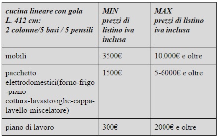 sono andata a vedere alcune delle catene di distribuzione di mobili, ho preso una cucina composta e prezzata ed ho provato a fare un preventivo con i miei listini di fascia media.