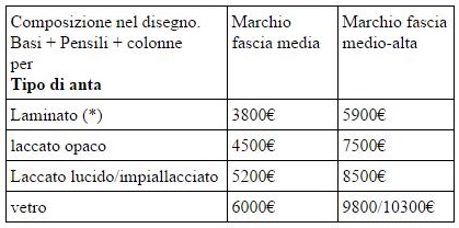 In genere le fasce di prezzo sono una decina, a seconda di quanti tipi di finiture e ante l’azienda offre. Riguardando la tabella dei prezzi più sopra si vede che tra il primo prezzo (laminato) e l’ultimo (vetro) in entrambi i marchi (economico/costoso) l’incremento è del 60% circa.