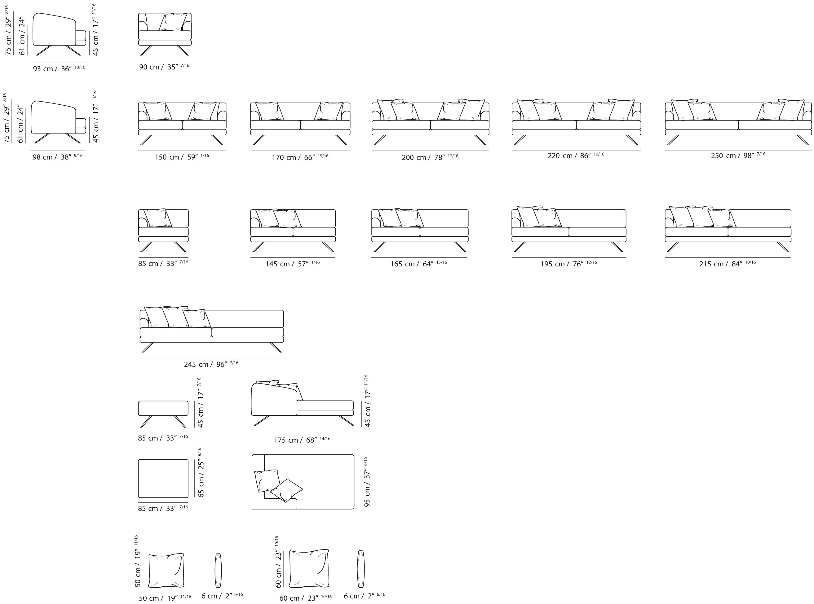 Si tratta di un sistema componibile quindi oltre al due posti (L.150 o 170cn.), al 3 posti (L.200 cm oppure 20 cm.), al 4 posti (L.250 cm) e alla poltrona (L.85 cm) ci sono a disposizione altrettanti elementi terminali (1,2,3 e 4 posti) per comporre il divano della lunghezza desiderata, la chaise longue ed il pouf.