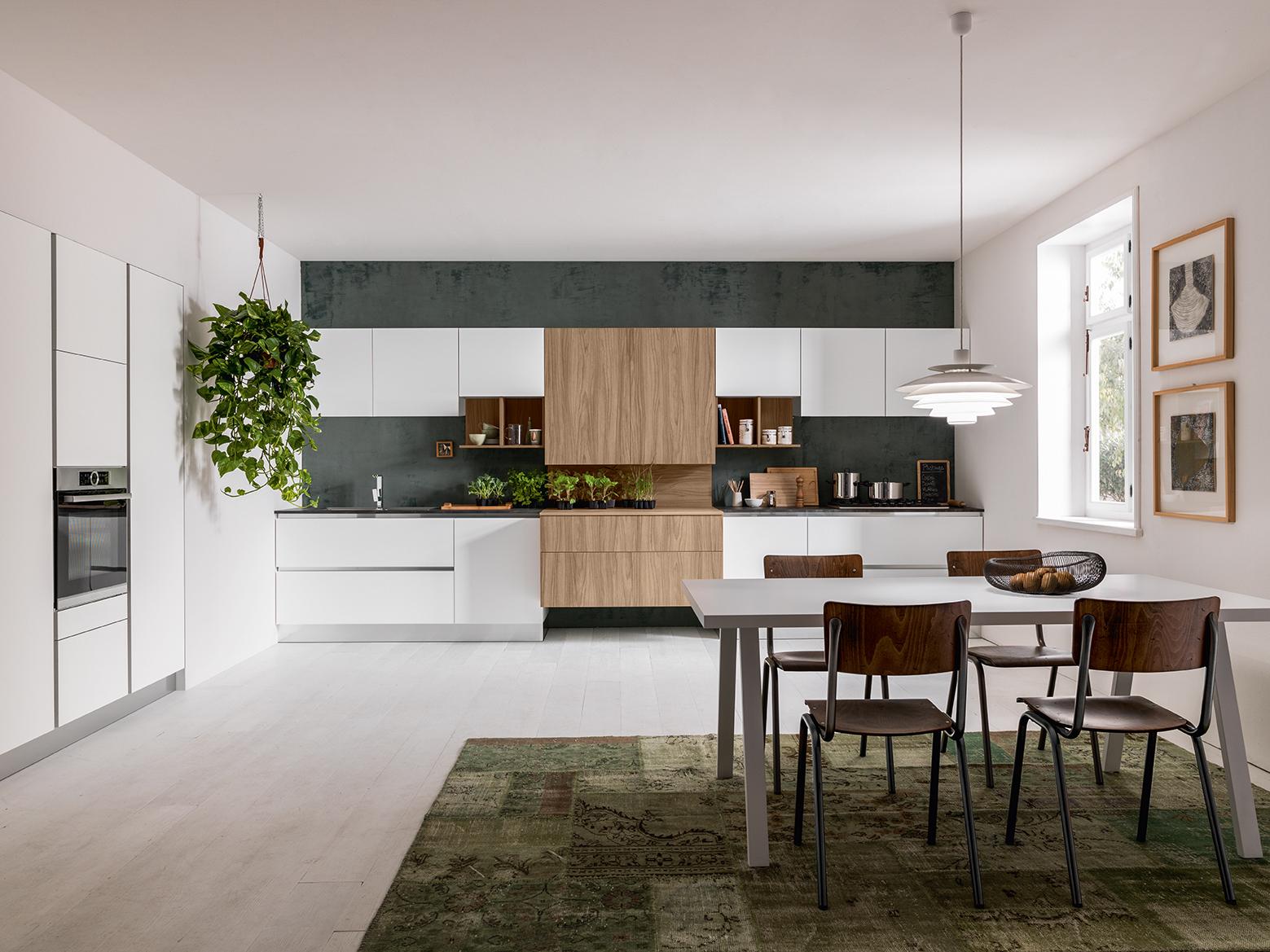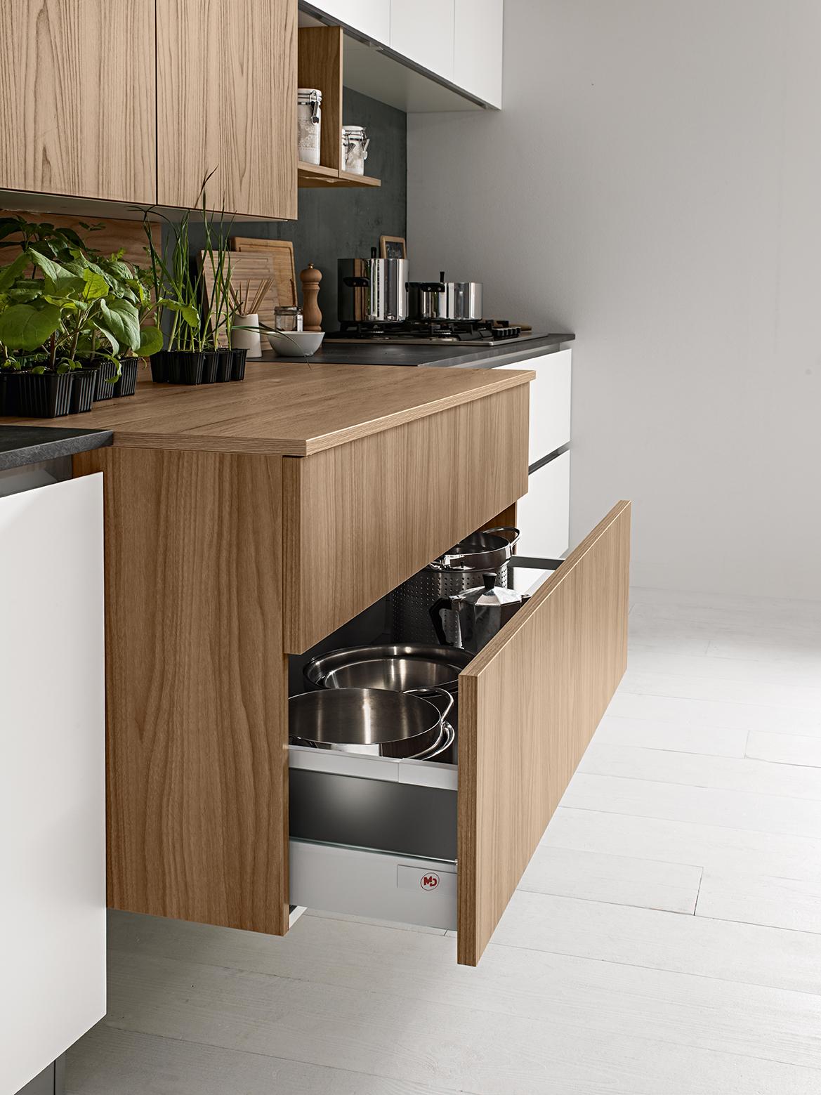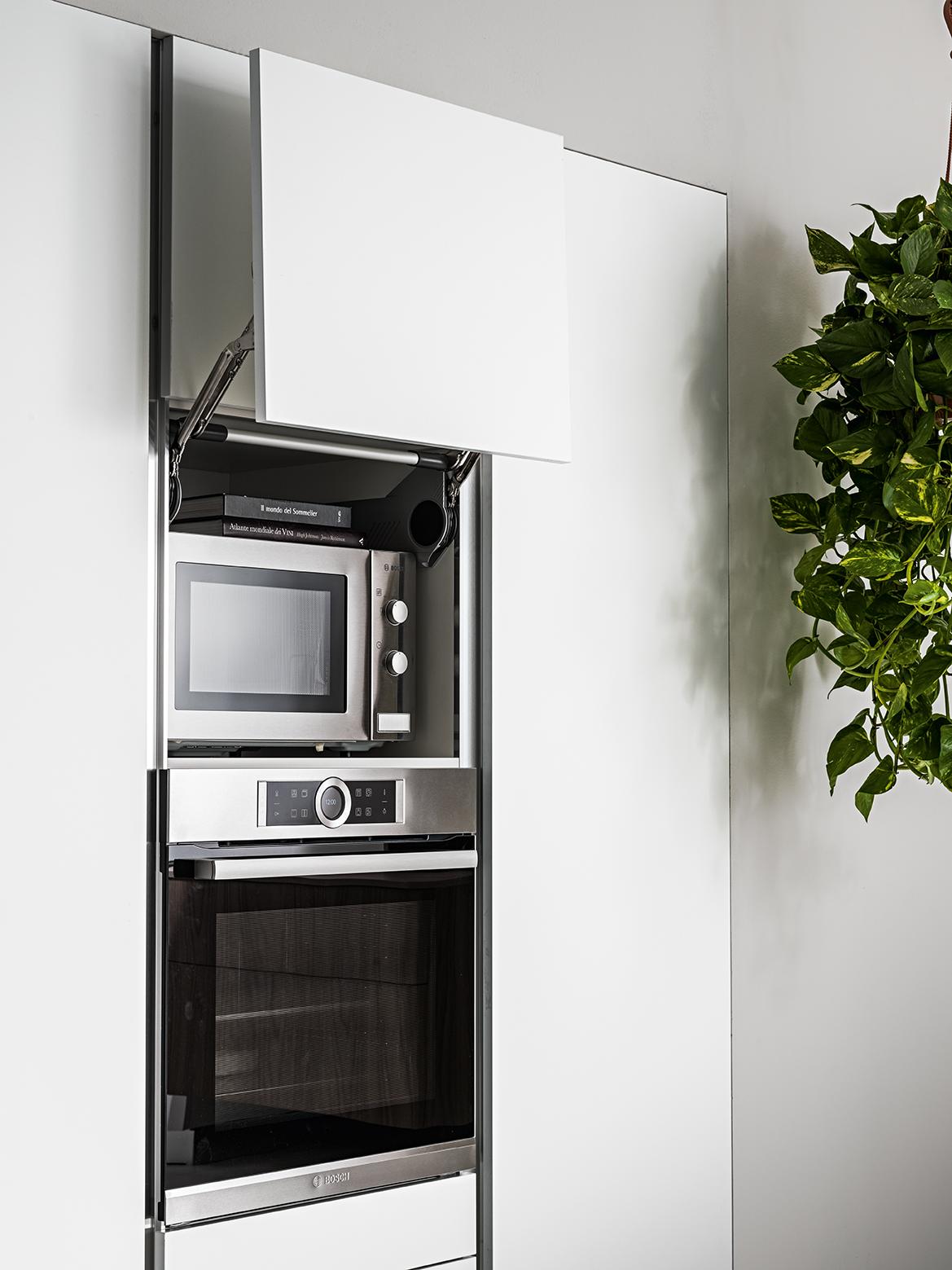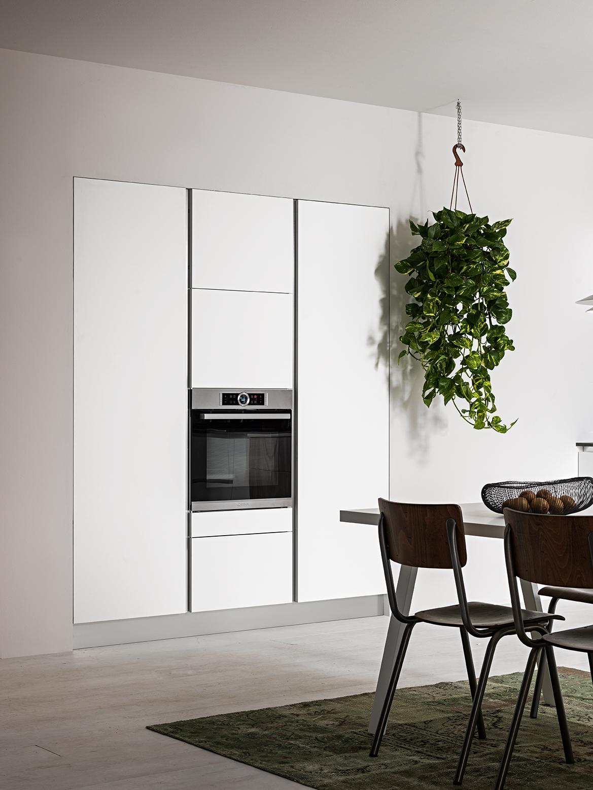 La linea 22 è caratterizzata dall'anta a forte spessore (22 mm appunto) con taglio a 45° per rendere facile l'apertura su tutta la lunghezza con gola piatta (più elegante). Questa composizione è composta dal lato basi-pensili con blocco centrale sospeso e più profondo 'esce' dal resto della cucina ed ha colore a contrasto. Su un lato il classico set di colonne (frigo - forni e dispensa).La misura di questa cucina: 480 cm per il lato basi (son tutte basi da 60 o da 120, è possibile ricrearla con basi da 45-90 scendendo a 360 cm) e 186 cm per il lato colonne che qui sono incassate in una nicchia in cartongesso