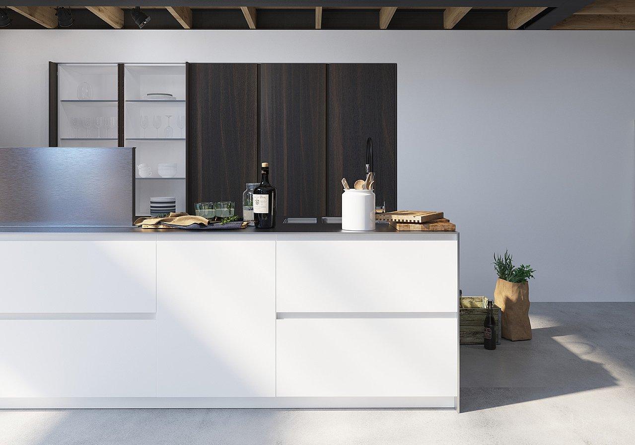 Cucina in legno laccato e termotrattato, con inserti di elementi vetro. L'anta è liscia senza maniglia (cucina con gola), la composizione è formata da un'isola centrale, operativa e con contenitori da ambo i lati ed un'ampia dispensa tutta a colonne. Questo è un prodotto di ottima qualità, modulare e su misura, componibile in infinite soluzioni per calzare come un guanto sul tuo spazio. Fatta per durare una vita.