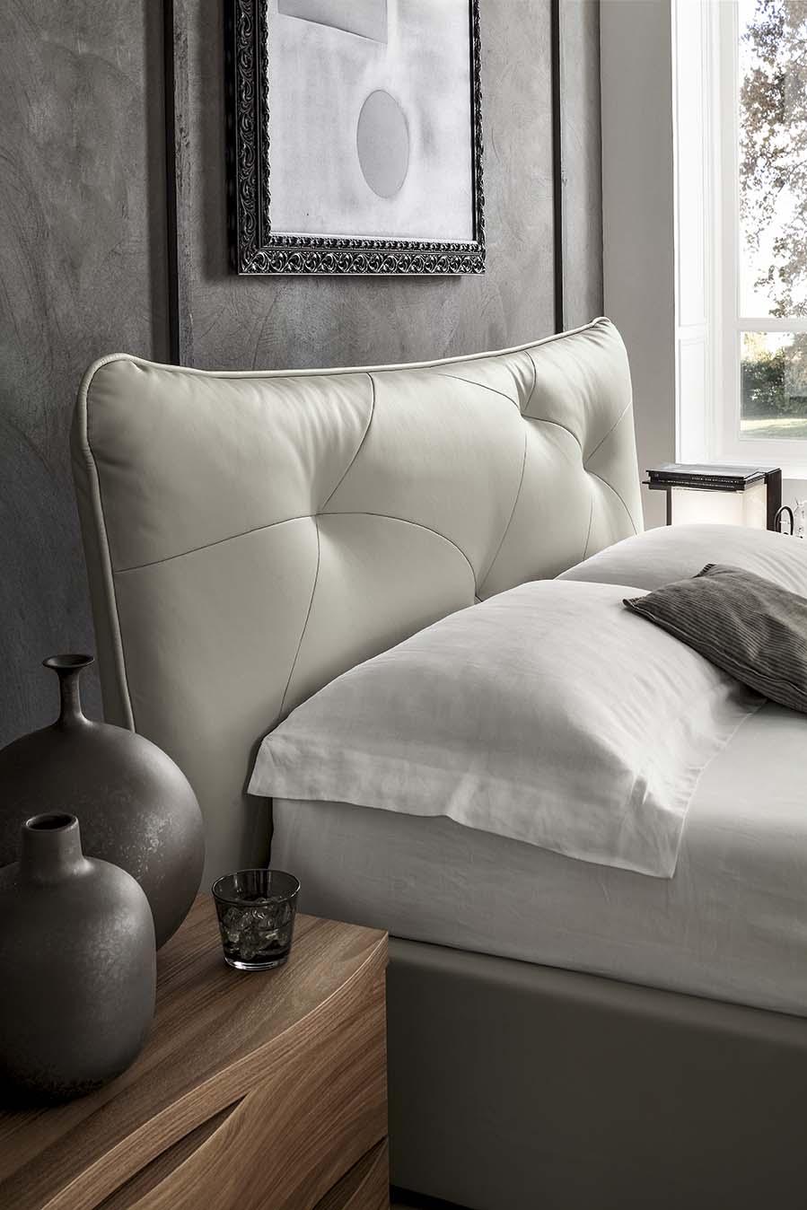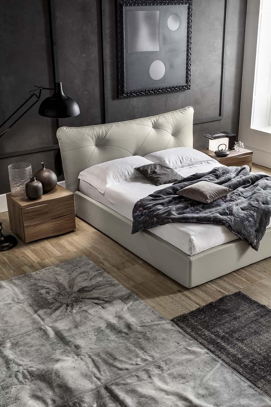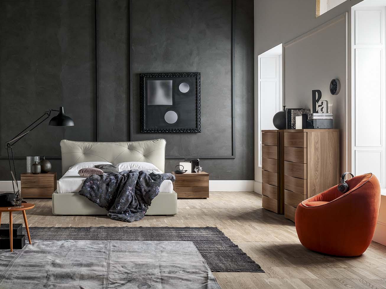 La morbida testiera di questo letto imbottito fa pensare alla comodità, all'accoglienza, al relax. Il letto è disponibile con rivestimento in ecopelle oppure tessuto (nella foto: ecopelle kashmir) e volendo internamente è possibile inserire il contenitore con meccanismo alza-rete (meccanismo classico oppure pratico). Il letto con contenitore è disponibile sia con rete standard (160x168) che nella misura king-size (180x200). I comodni e settimanali proposti on essenza noce cognac (materica, antigraffio) contrastano i toni chiari del letto, i frontali dei cassetti sono caratterizzati dalle curvature a verso alternato che donano un movimento regolare e gradevole.