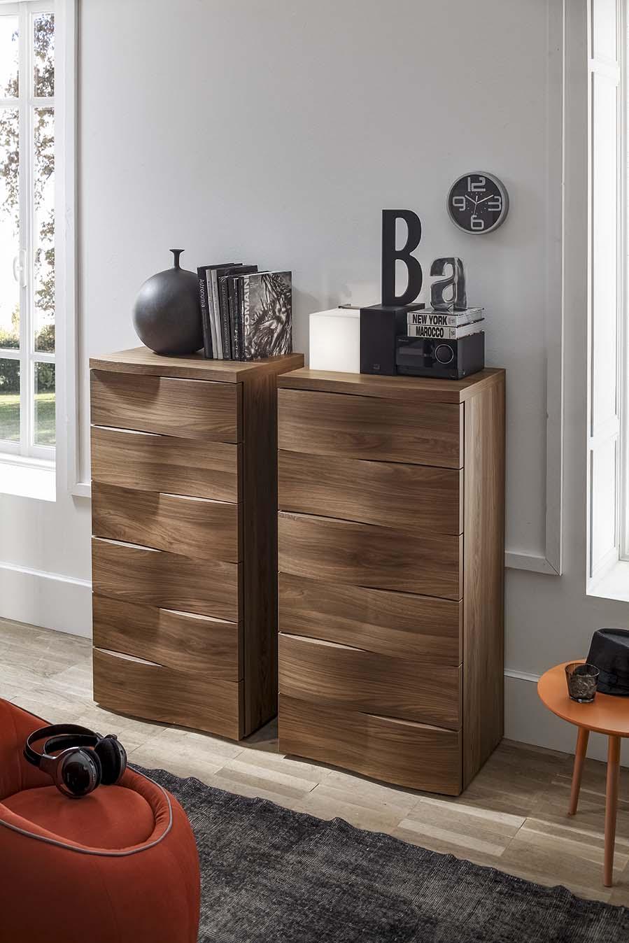 Comodini e settimanali: essenze tipo-legno materiche e antigraffio nelle finiture: olmo bianco, naturale, gesso, cotto, rovere cenere, noce cognac.