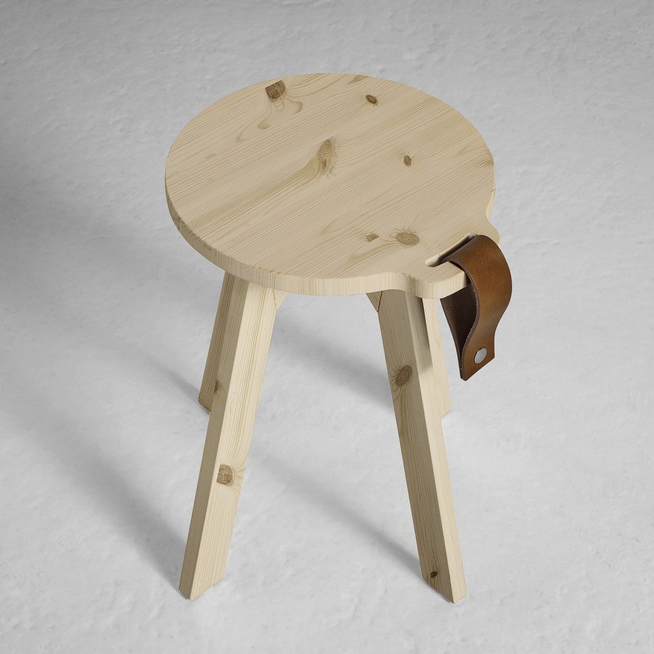 Sgabellino in legno di pino, dal design molto semplice, caratterizzato da una fettuccia in cuoio che lo rende pratico e caratteristico. Proposto in 4 colori: legno naturale, bianco, nero, grigio ghiaccio.