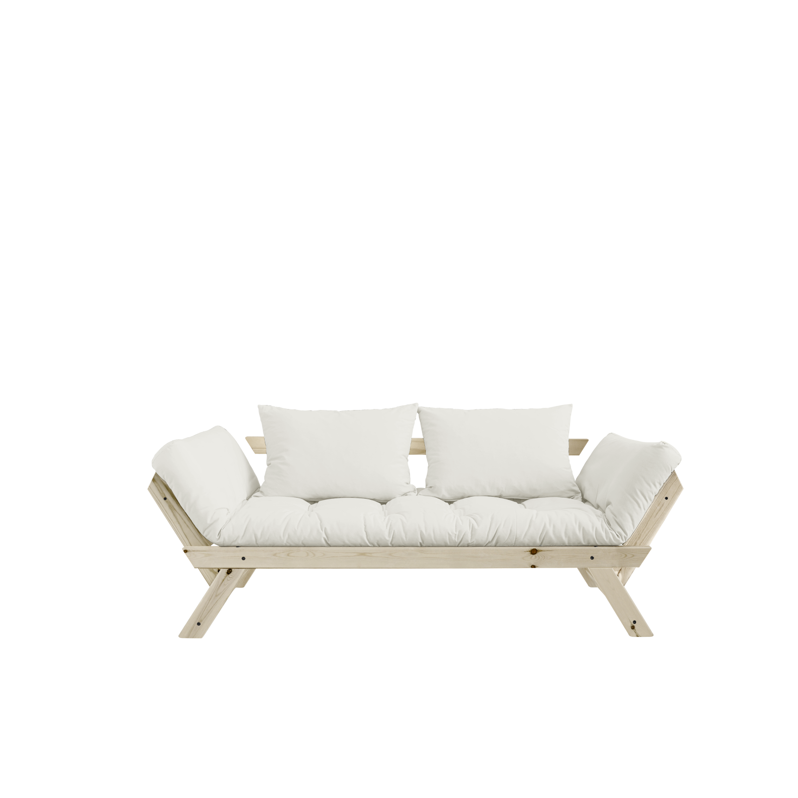Questo divanetto, una volta reclinati i braccioli diventa una comoda chaise longue o un letto d'emergenza, non ci sono meccanismi pesanti né scomodi, realizzato in legno di pino con futon disponibile in vari colori.