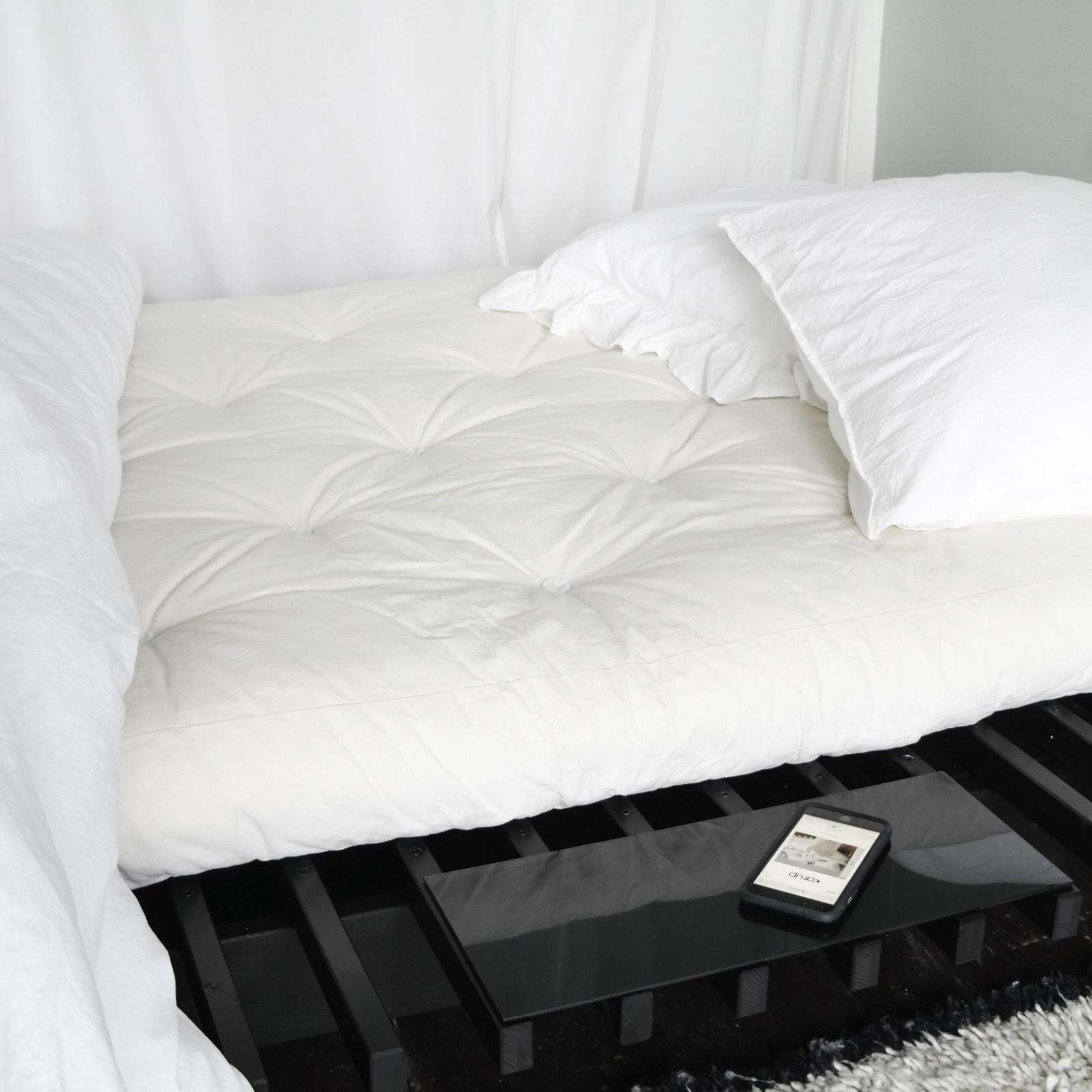 coppia di tavolini in vetro nero da appoggiare lateralemente sul letto Blues di Karup, acquistabile solo assieme al letto. Misura 20x50 cm ATTENZIONE: per poter posizionare il tavolino correttamente è opportuno acquistare il letto una misura più grande rispetto al materasso, ad esempio:
