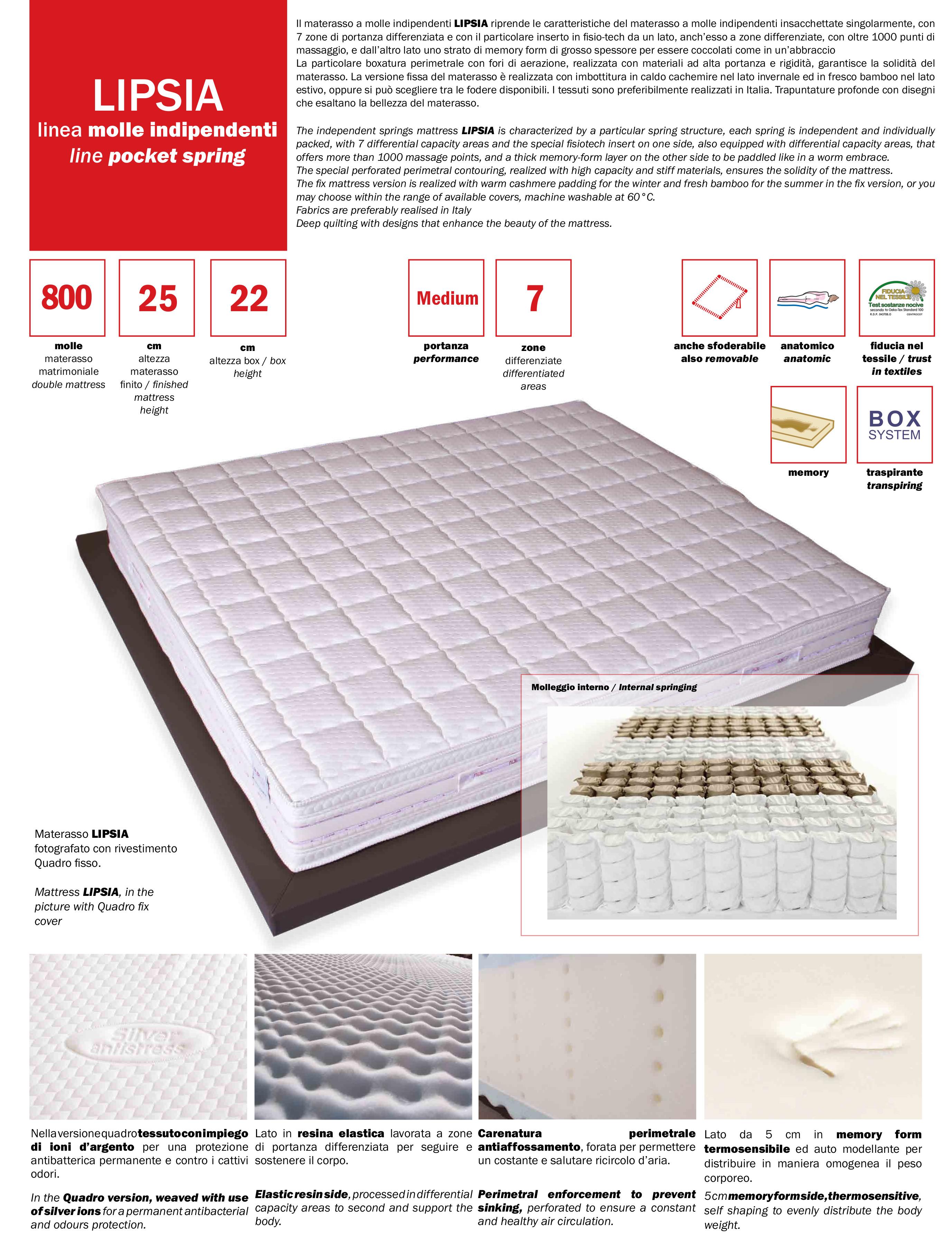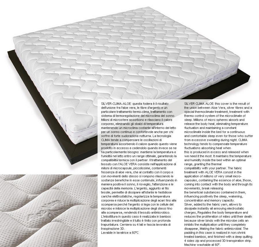 Un buon materasso fabbricato in Italia: 800 molle indipendenti insacchettate, portanza differenziata (7 zone) anatomico e traspirante. Particolarmente accogliente poiché ha uno strato di 5cm di memory su un lato. Un materasso solido e durevole. Disponibile anche in versione fissa oppure sfoderabile con rivestimento Silver Aloe (con trattamento termo-clima) incernierato sui 4 lati e lavabile in lavatrice a 60° (vedi scheda nella galleria immagini)