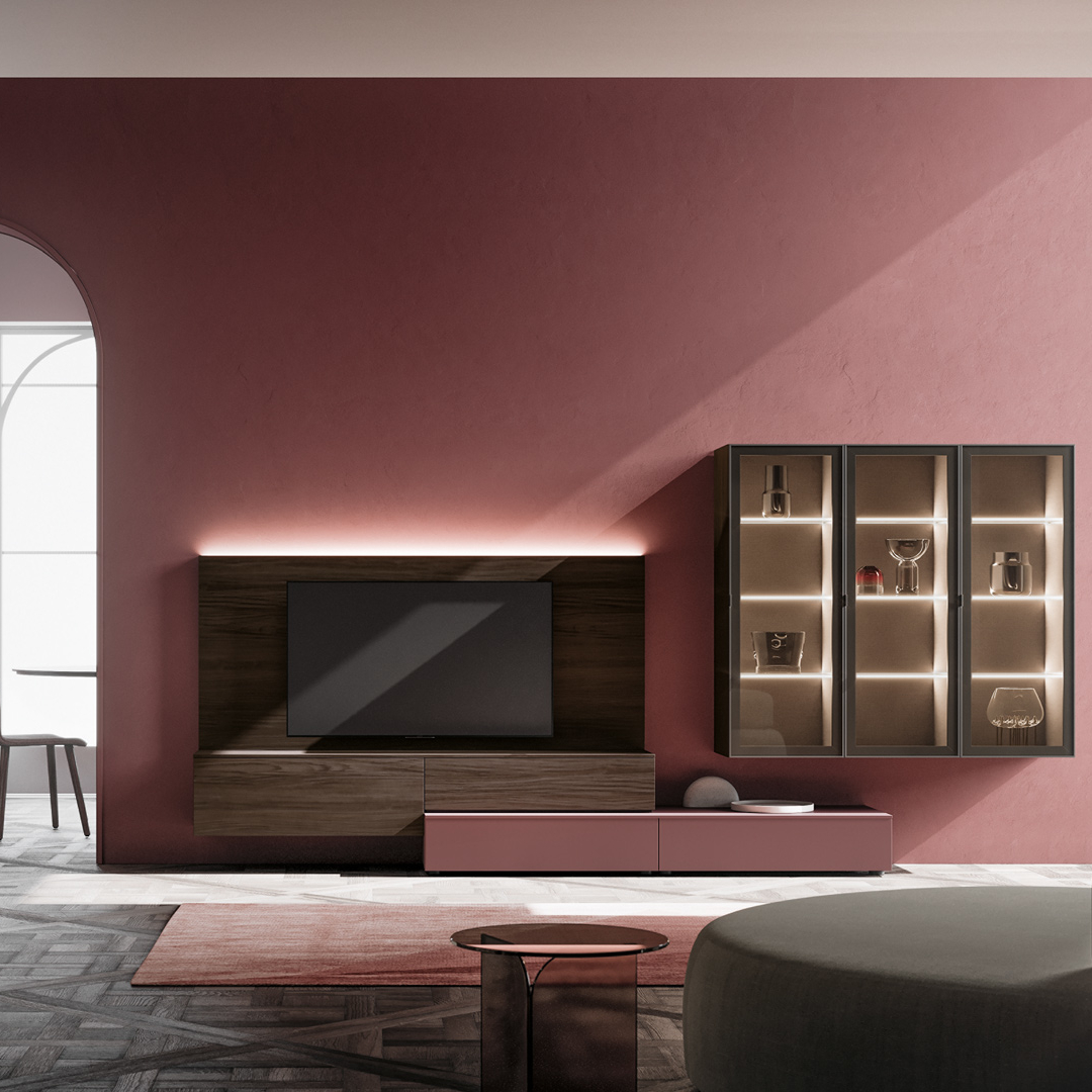 Un soggiorno elegante in cui le basi sono integrate ad uno schienale porta tv e abbinate a pensili con ante in vetro. La madia completa lo stile e la funzionalità. Poichè si tratta di un sistema componibile è personalizzabile ed adattabile a misure diverse.