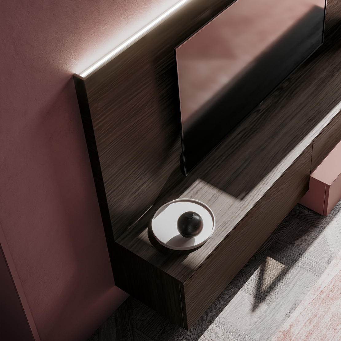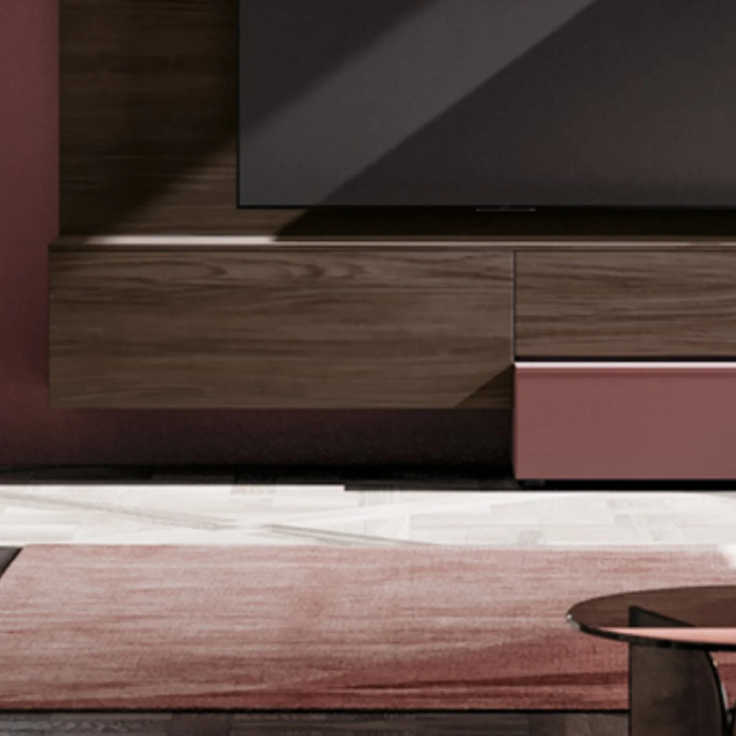 Un soggiorno elegante in cui le basi sono integrate ad uno schienale porta tv e abbinate a pensili con ante in vetro. La madia completa lo stile e la funzionalità. Poichè si tratta di un sistema componibile è personalizzabile ed adattabile a misure diverse.