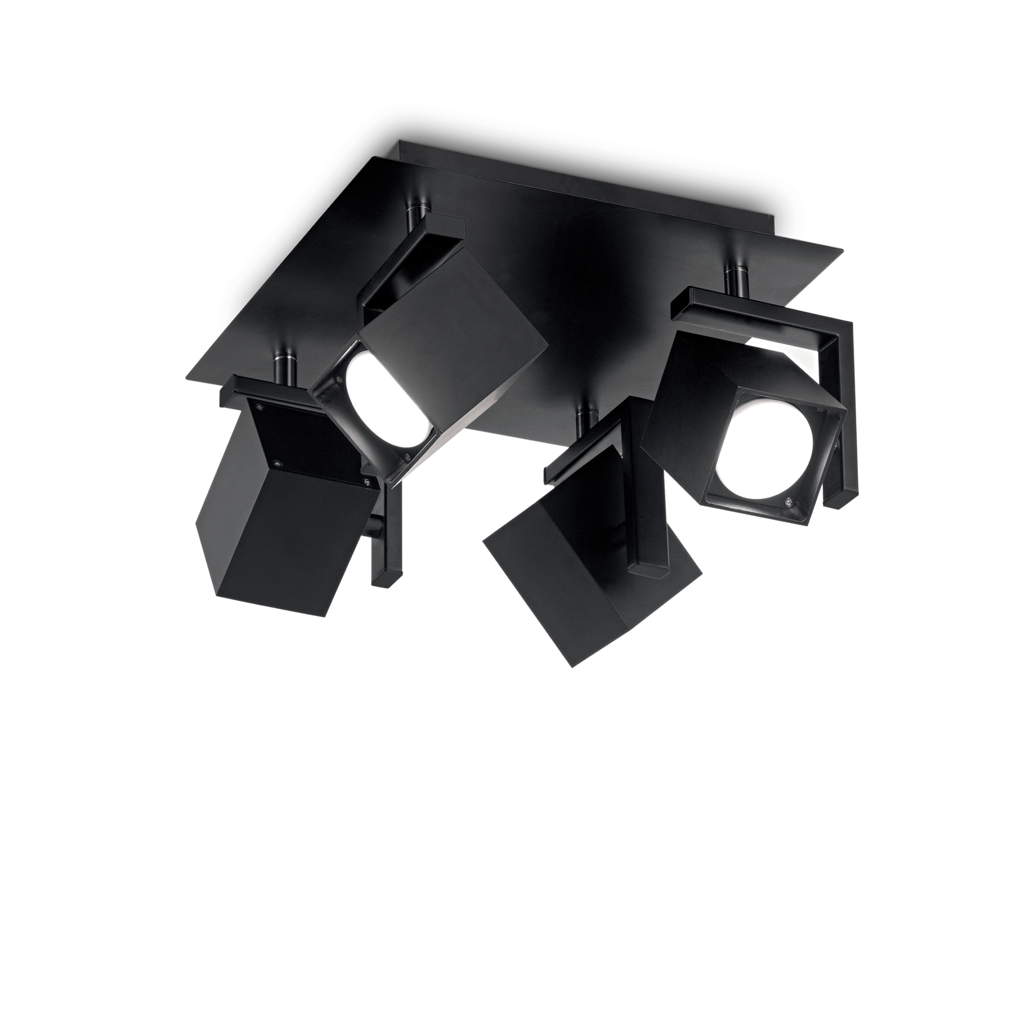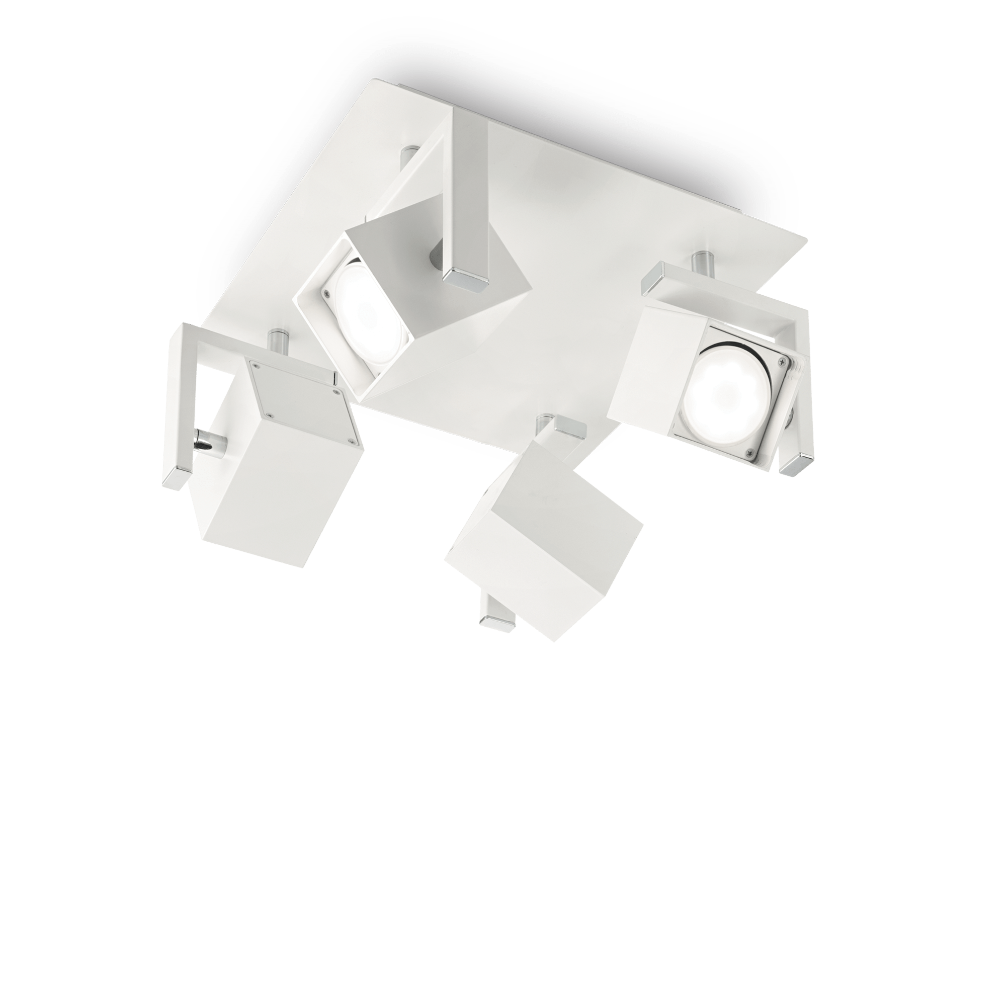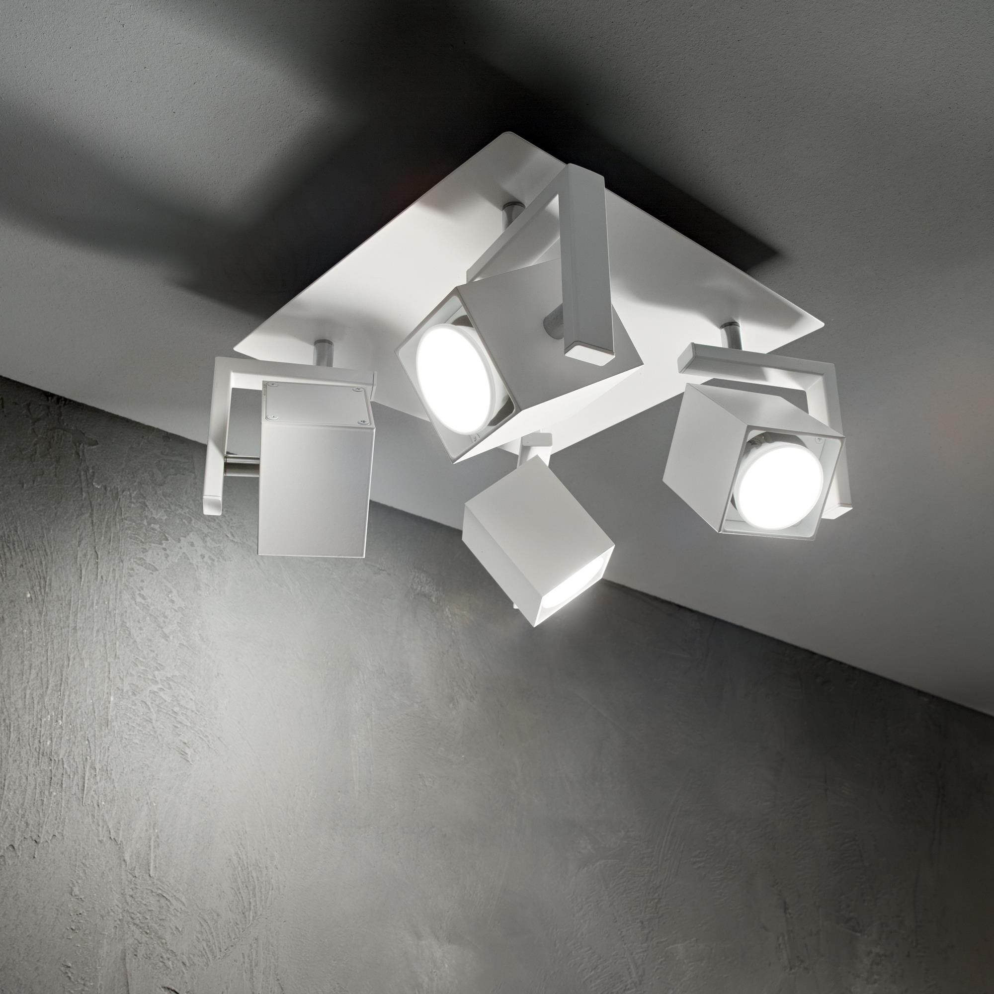 Plafoniera a soffitto dal design tecnico, realizzata in metallo rifinito con vernice opaca e dettagli in cromo. Diffusori orientabili. Disponibile in bianco oppure nero, le lampadine non sono incluse.