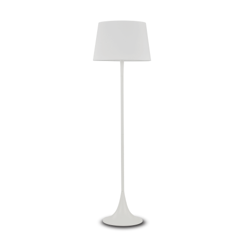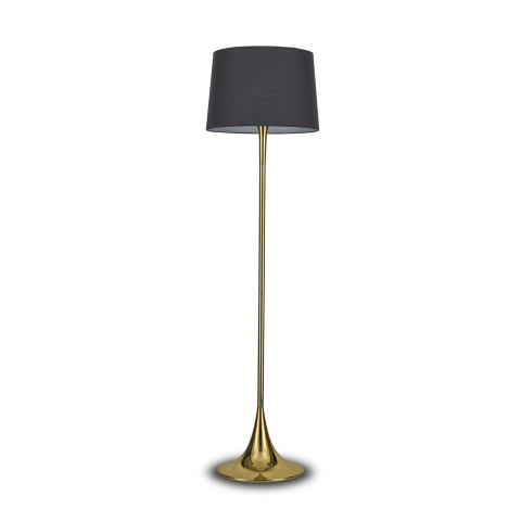 Lampada da terra moderna dalle linee aggraziate. Montatura in metallo rifinito in ottone o con vernice opaca bianca o nera. Paralume in lamina di PVC rivestito di tessuto.