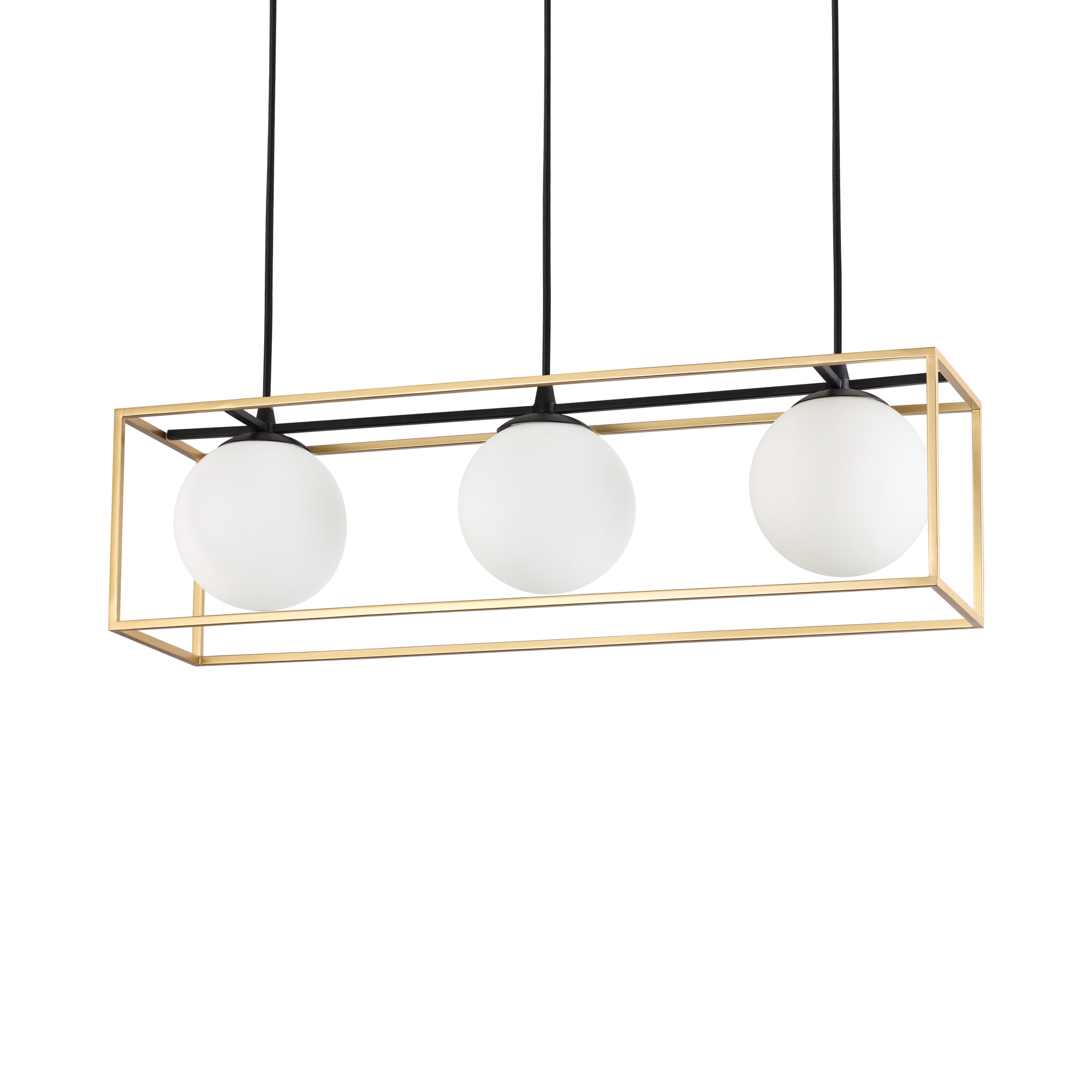 Lampadario a tre luci, moderno, in ottone.Montatura in metallo verniciato: base nera opaca e telaio ottone opaco. Diffusori in vetro incamiciato bianco, soffiato e acidato.