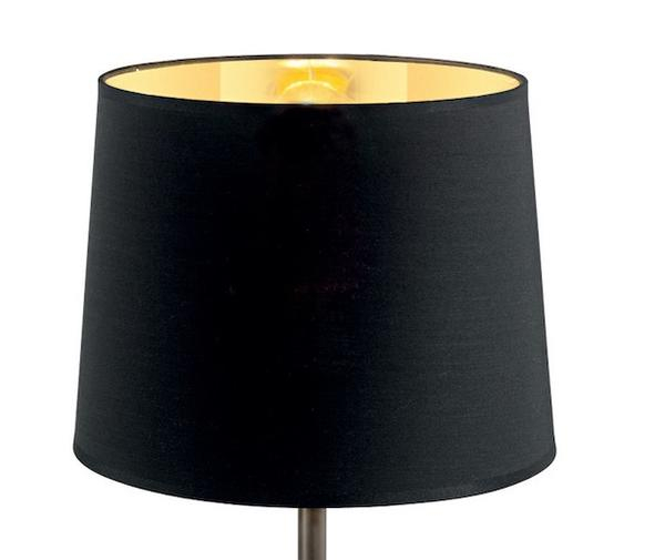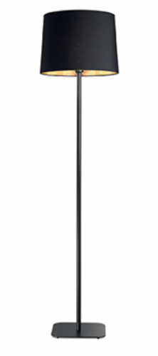 Lampada da terra, design nordico, minimale, elegante. Montatura in metallo verniciato nero opaco. Paralume in lamina di PVC dorato rivestito in tessuto nero.