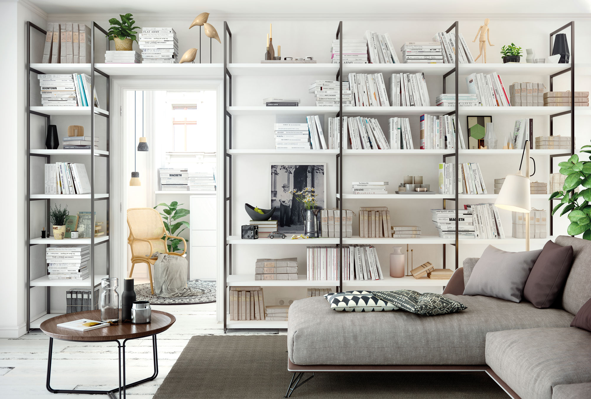 parete attrezzata realizzata con sistema a montanti in ferro nero, e ripiani melaminico bianco, le misure dei vani sono personalizzabili, in questa proposta partendo da sinistra abbiamo: