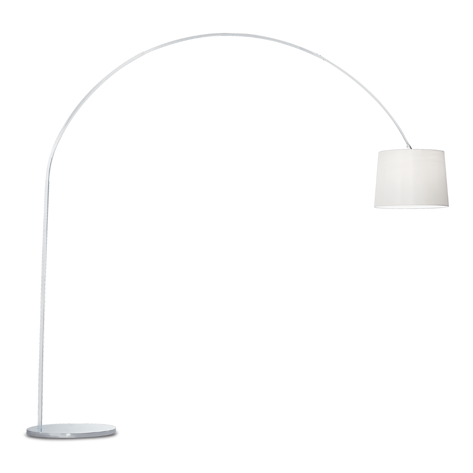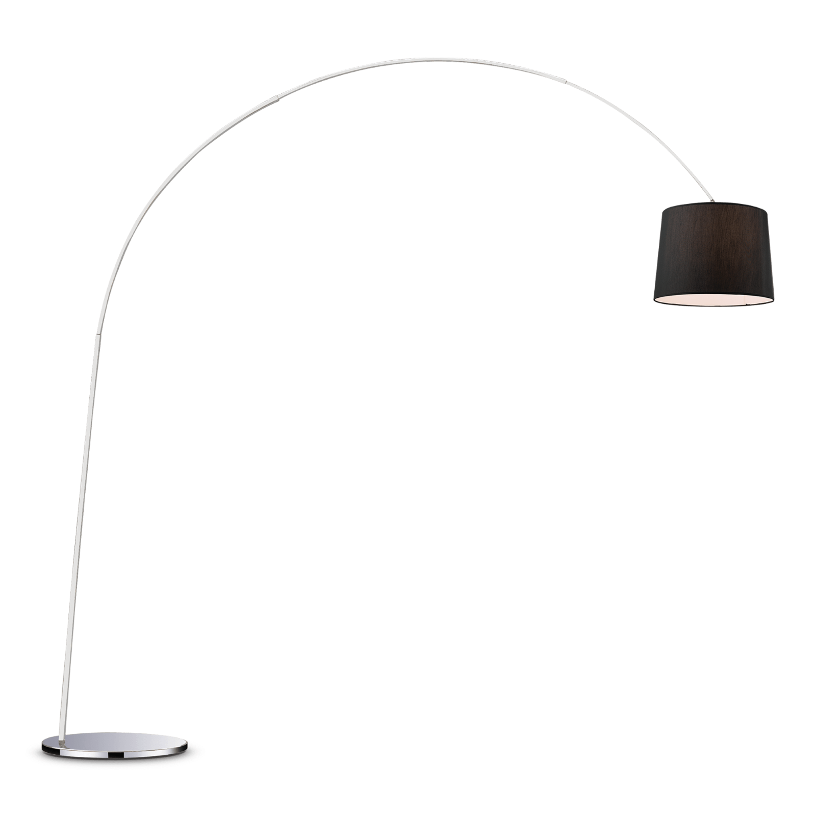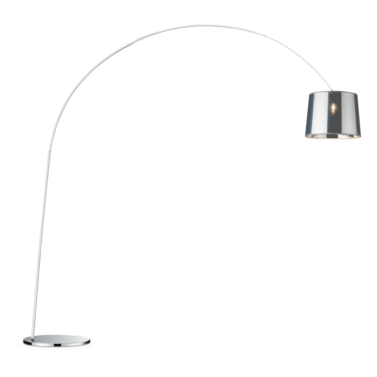 Lampada da terra con montatura in metallo rifinito in cromo o con vernice opaca bianca o nera. Braccio a sezione quadrata composto da tre elementi. Paralume in lamina di PVC, disponibile in colore cromo o rivestita in tessuto bianco o nero.