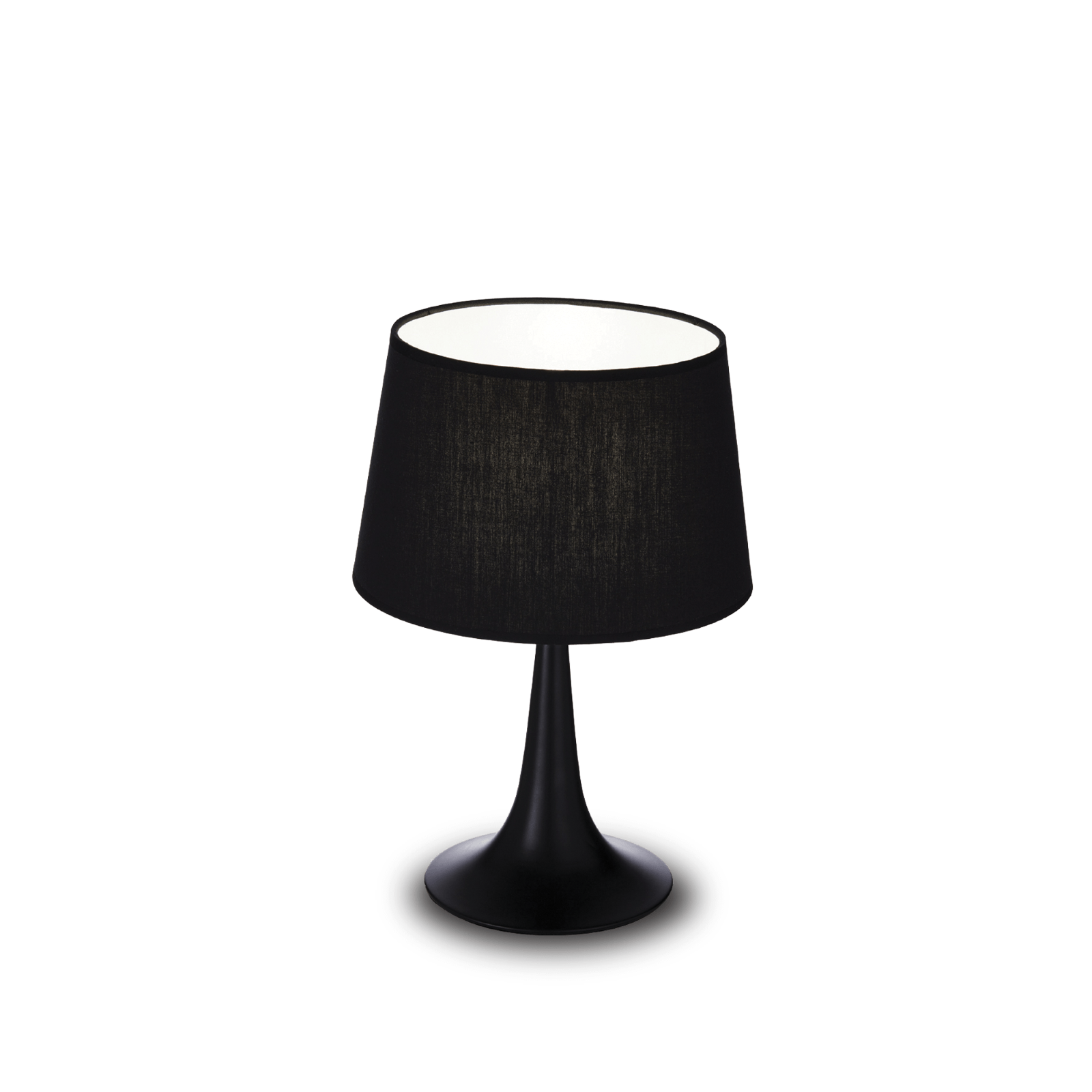 Lampada da tavolo con montatura in metallo rifinito in ottone o con vernice opaca bianca o nera. Paralume in lamina di PVC rivestito di tessuto. Disponibile in due misure