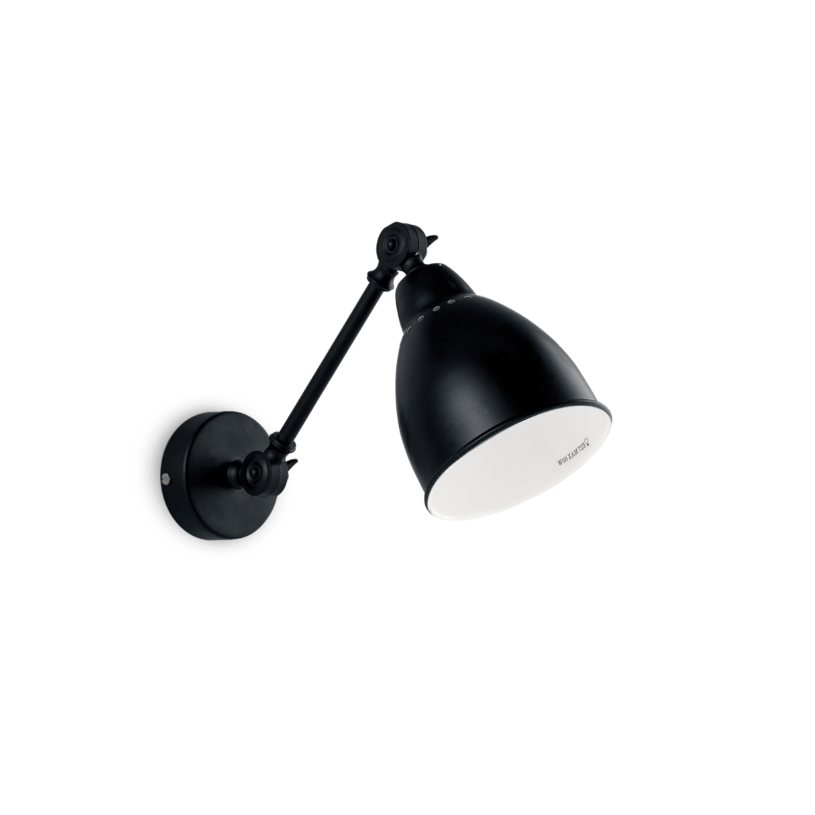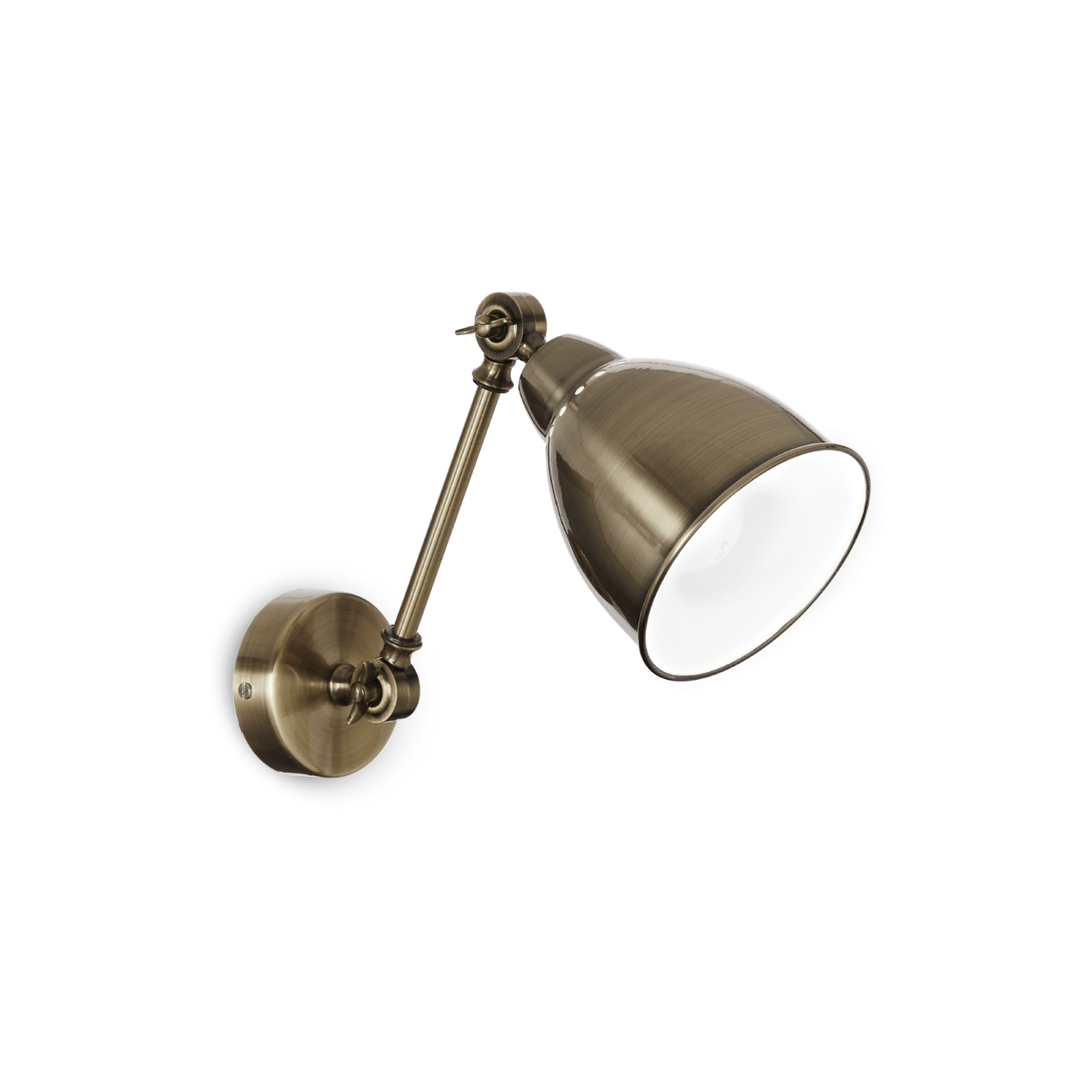 Applique da interno con montatura e diffusore in metallo. Disponibile con finitura in nickel satinato, brunito o con vernice nera opaca. Braccio regolabile. Diffusore orientabile smaltato bianco all'interno.