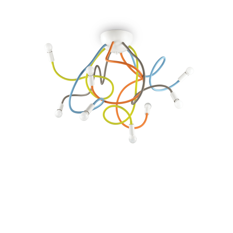 Plafoniera per interno, montatura in metallo rifinito con vernice opaca. Bracci flessibili rivestiti di gomma. Cavo in acciaio regolabile in lunghezza da dispositivo automatico. Disponibile tutto bianco o con i bracci multicolore.