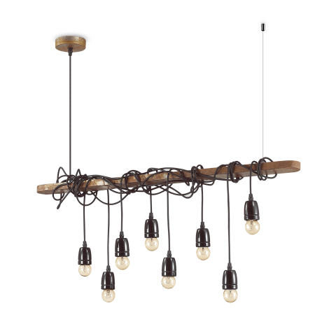 Sospensione per interno, montatura in metallo rifinito corten. Cavo in tessuto. Portalampade in ceramica smaltata. Cavi in acciaio a lunghezza regolabile.