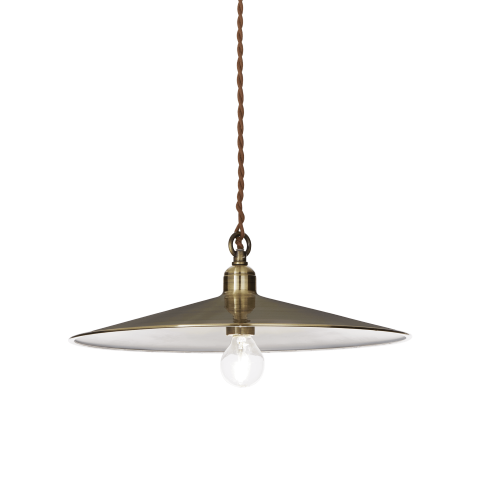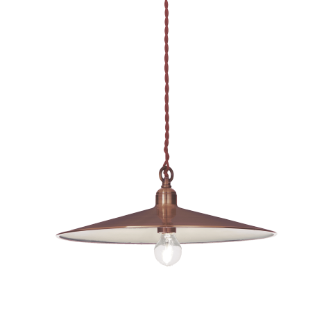 Sospensione per interno, montatura, diffusore e copriportalampada in metallo disponibile con varie finiture. Cavo elettrico rivestito in tessuto e intrecciato.