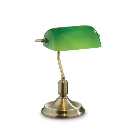 Lampada da tavolo vintage, la montatura è in metallo con finitura disponibile in ottone, in cromo o in brunito. Diffusore in vetro soffiato e incamiciato.