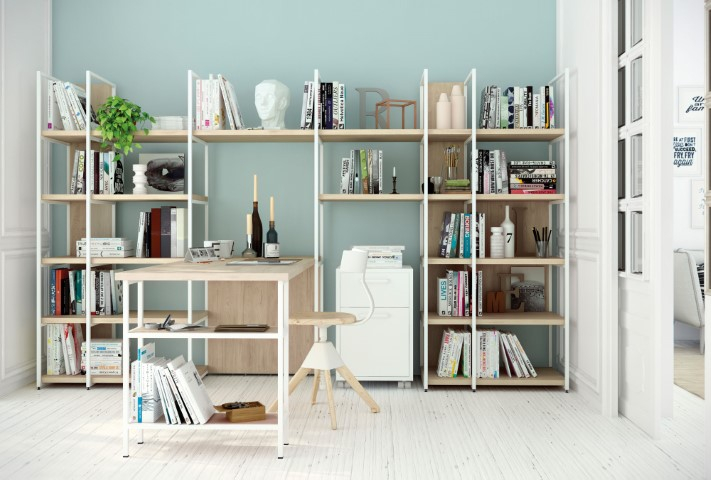 Libreria con penisola realizzata con il sistema componibile Olut disponibile in molte finiture e misure, questo è un esempio che puoi acquistare così come sta oppure modificare a tuo piacimento.