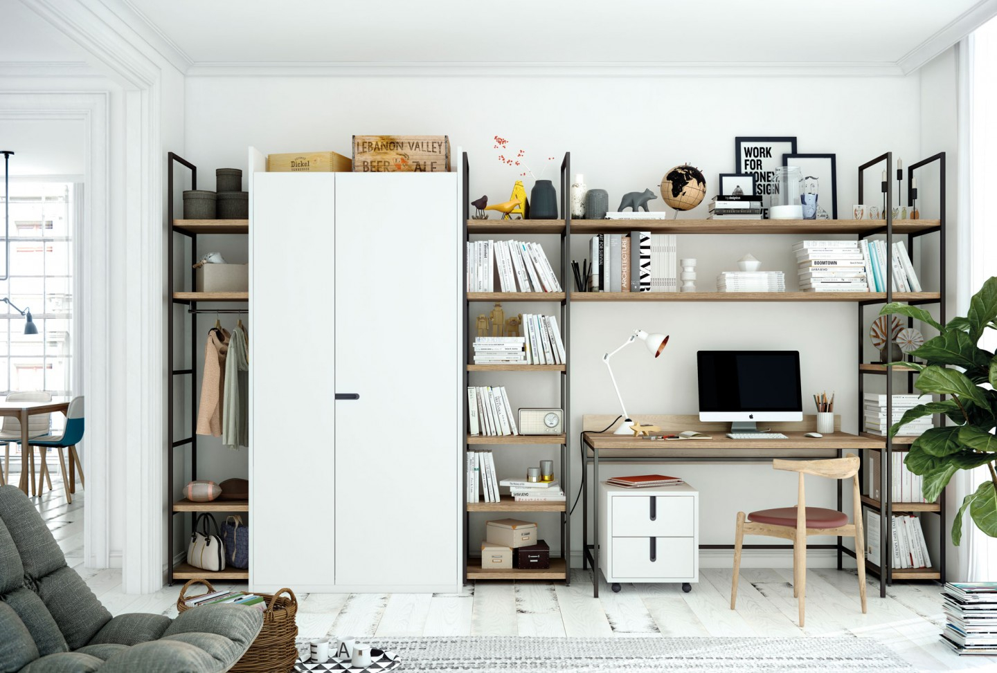 parete attrezzata mista guardaroba e angolo studio, è realizzata con il sistema componibile Olut disponibile in molte finiture e misure, questo è un esempio che puoi acquistare così come sta oppure modificare a tuo piacimento.