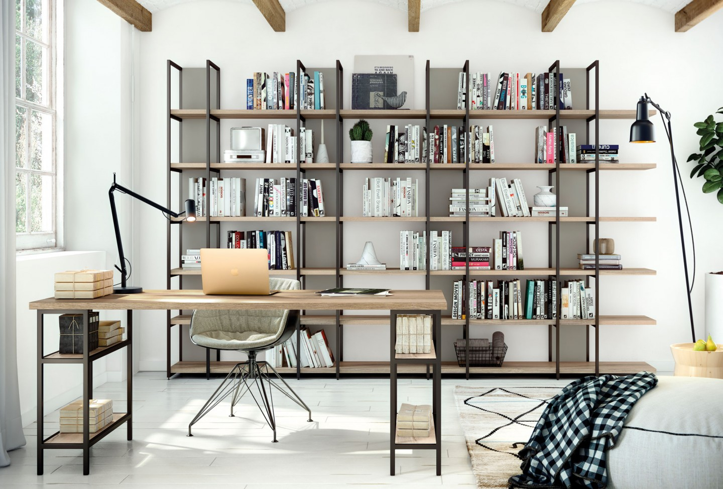 Libreria con penisola realizzata con il sistema componibile Olut disponibile in molte finiture e misure, questo è un esempio che puoi acquistare così come sta oppure modificare a tuo piacimento.