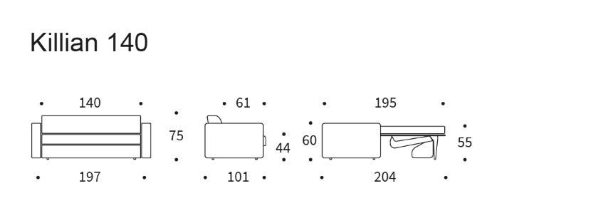 Dimensioni : Killian 140 ( Divano chiuso: 197 x 101 x h 75 cm. Divano letto : 197x204 cm, materasso: 140x195 ) Killian 160: (Divano chiuso: 217 x 101 x h.75 cm. Divano letto : 217x204 cm, materasso 160x195 )