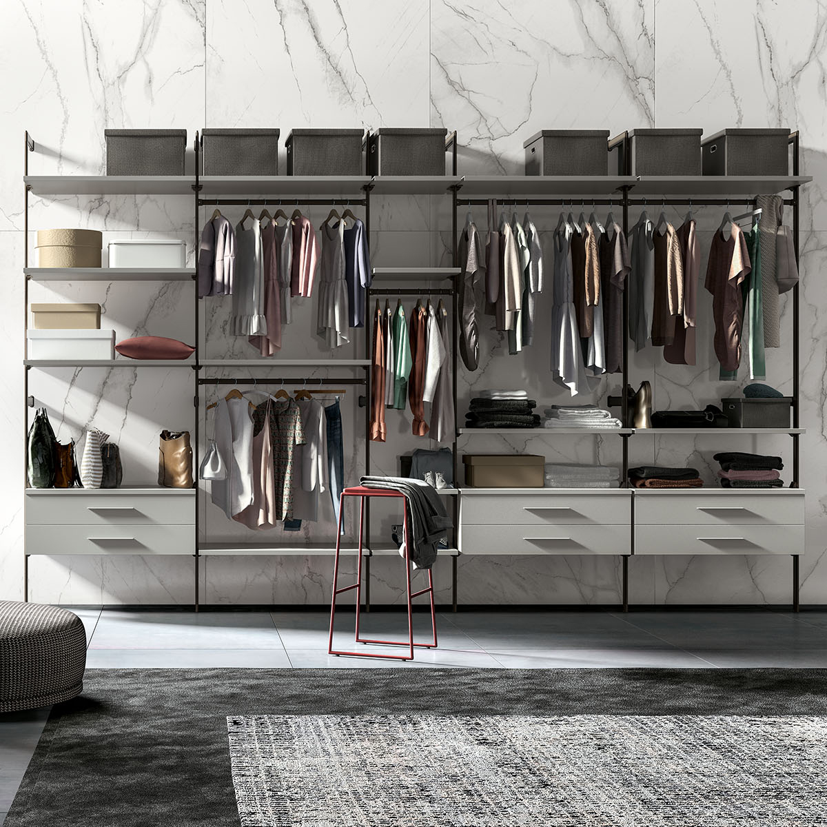 Parete attrezzata a guardaroba, realizzata con montanti a parete. La composizione proposta è in laccato opaco RAL 7038 (ripiani ed elementi). Per misure e dettagli clicca sulla scheda composizione in alto.