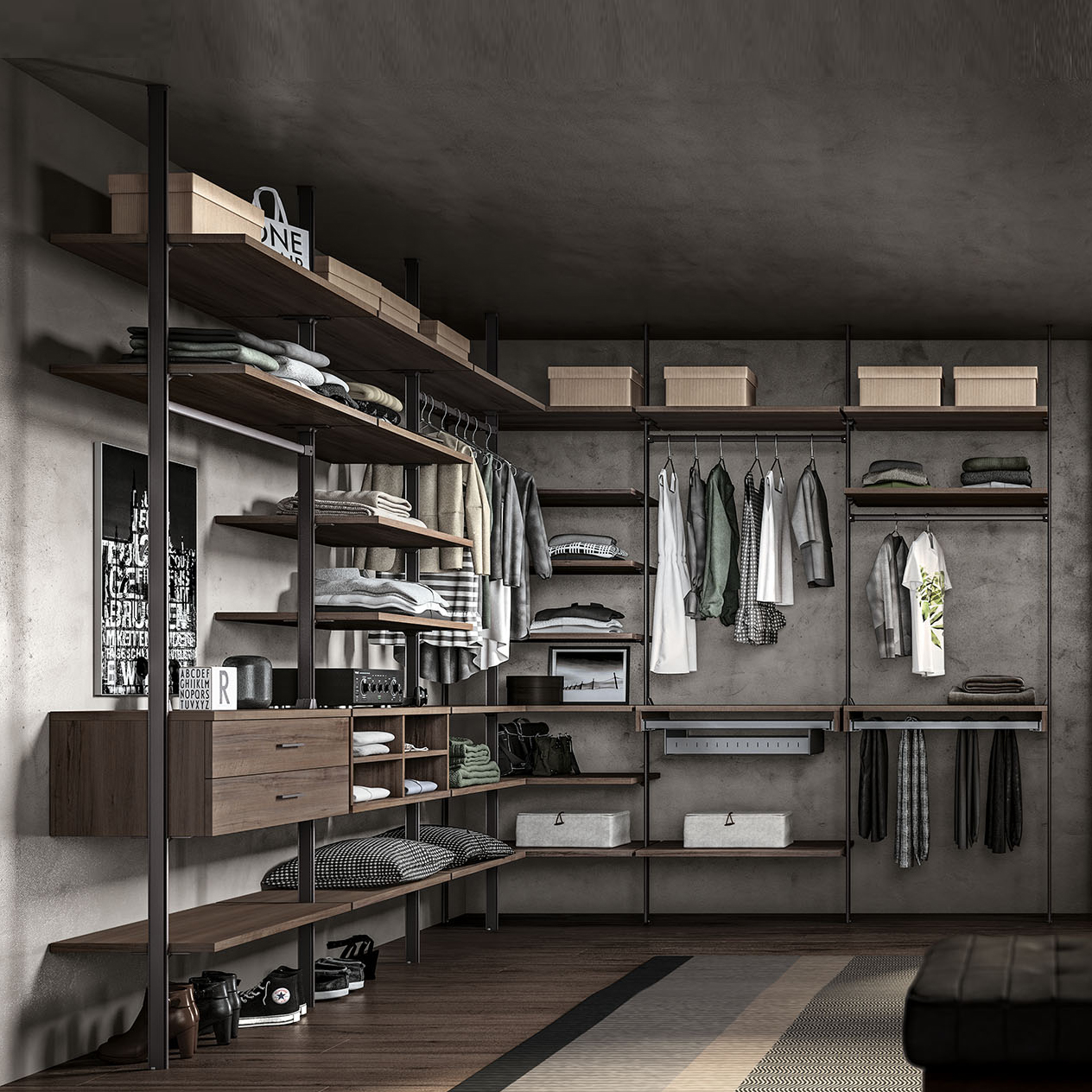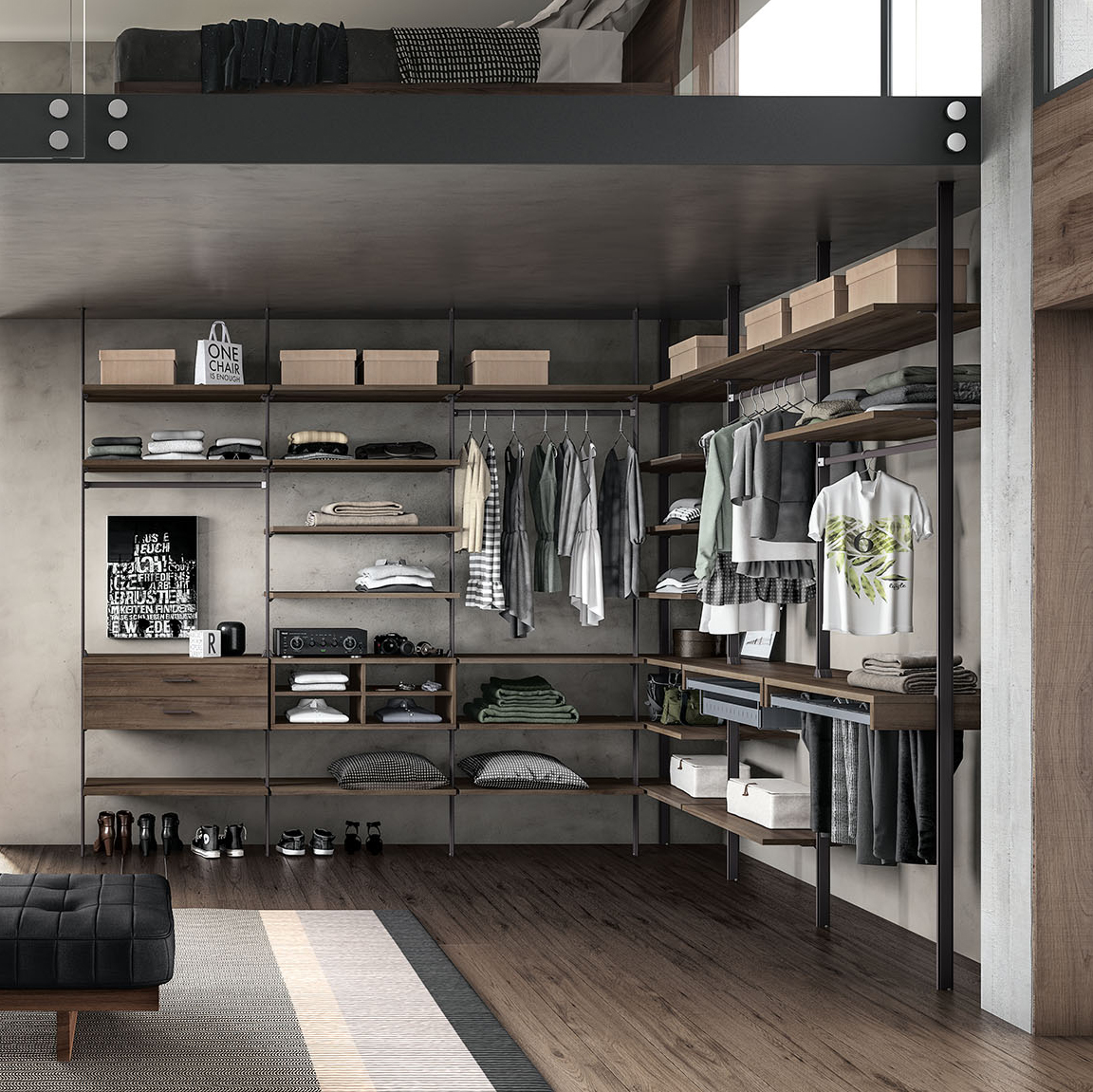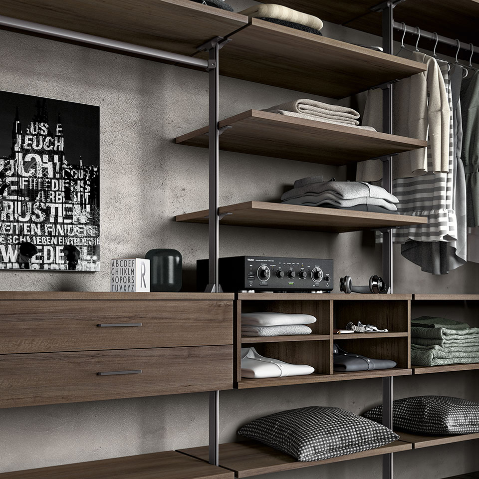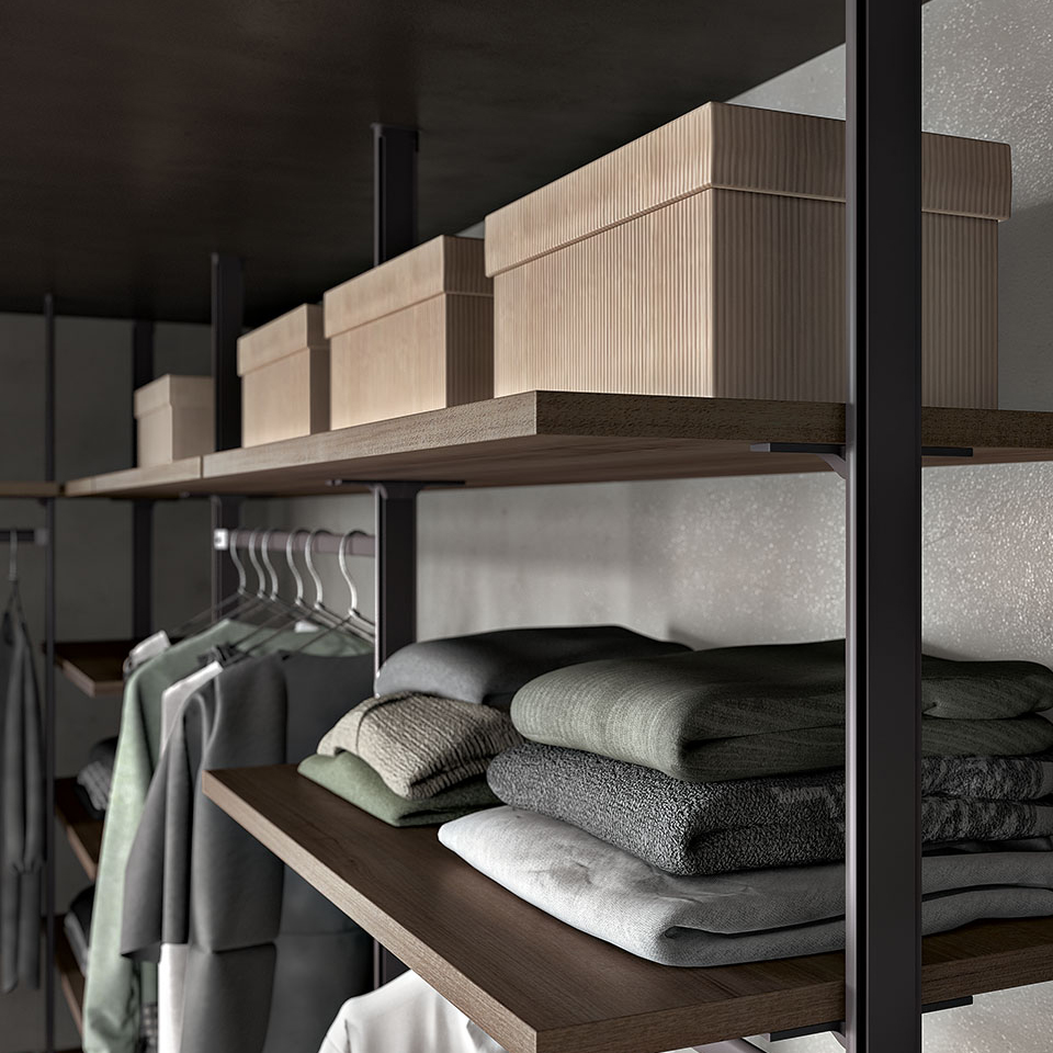 Le parti in metallo (montanti e reggi ripiani, tubi appenderia ecc) sono in alluminio disponibile in due finiture: brunito e bianco.